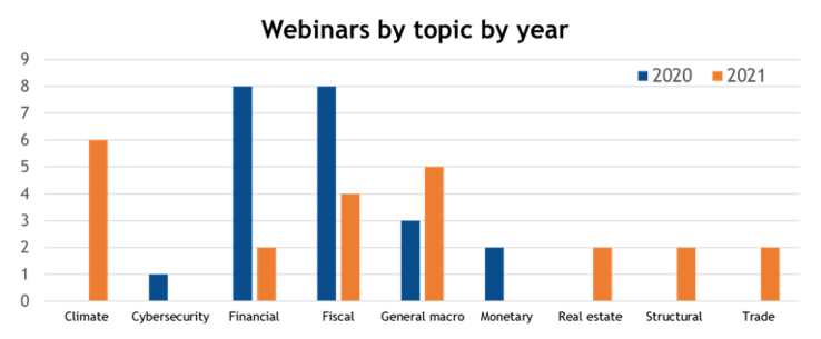 Moving away from the COVID-19 focus and the high reliance on IMF speakers in 2020, webinars in 2021 covered a broader range of issues and included more panelists from other institutions. A series of webinars was organized on climate change issues in 2021.